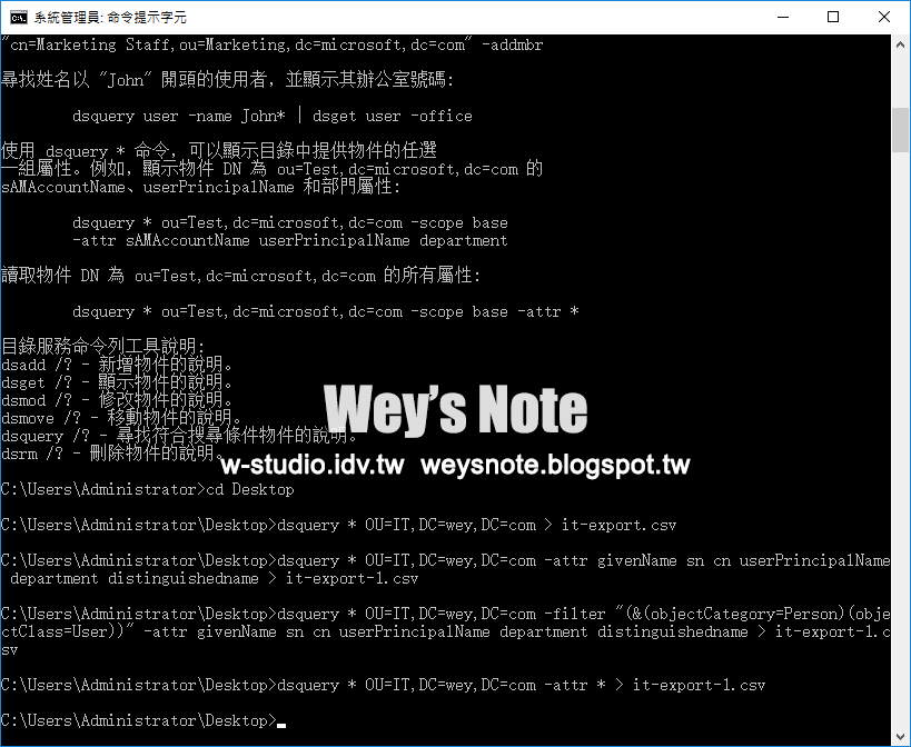 雖然 dsquery 匯出的資料格式與 csvde 類似, 不過 dsquery 是用空格來做欄位分隔, 而不像 csvde 使用逗號來做欄位分隔, 利用上比較不方便